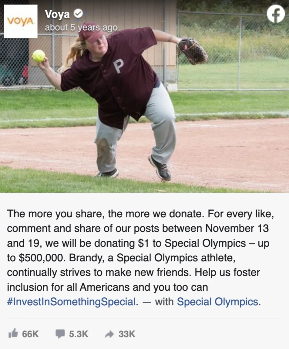 After becoming official sponsors of Special Olympics, Voya wanted to give back even more. So we created a social campaign called #InvestInSomethingSpecial and asked athletes to tell us their goals for the future. For every like and share they got on social media, Voya donated $1 to Special Olympics.