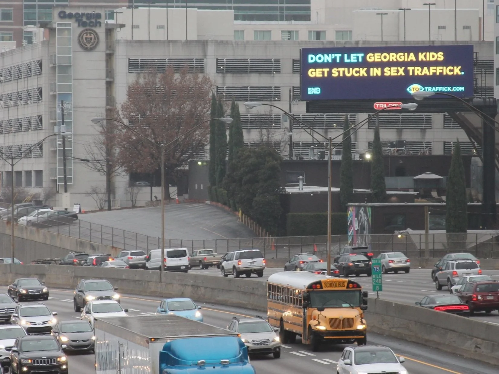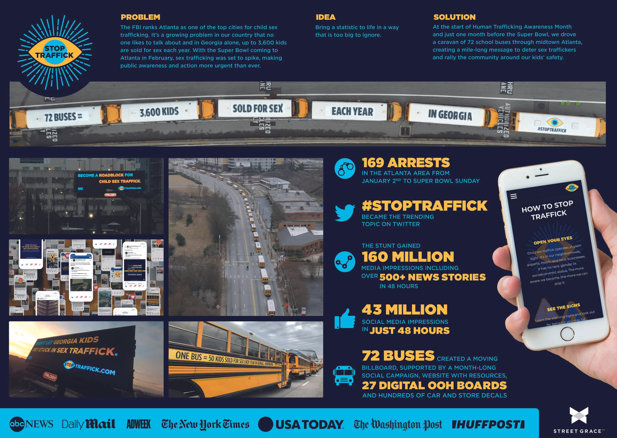 Child sex trafficking is a massive problem in Georgia that often gets ignored. So we partnered with Atlanta-based nonprofit, Street Grace, to put this issue on the map…literally. At the start of Human Trafficking Awareness Month, we drove 72 yellow school buses on symbolic route through the heart of Atlanta to gain awareness for how large this issue truly is.