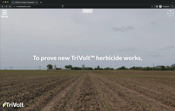 TriVolt is a corn herbicide that delivers weed-free fields for up to 8 weeks. To a farmer, 8 weeks is an impressive claim that sounds too good to be true. So to prove that it works as good as we say, we placed a camera in a field treated with TriVolt and filmed for 8 weeks straight. By helping them see the truth with their own eyes, TriVolt outsold the previously most successful herbicide launch five times over.